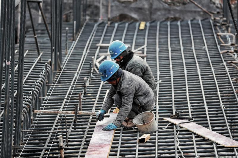 2月2日,在东庄水利枢纽工程施工现场,建筑工人正在绑扎钢筋。