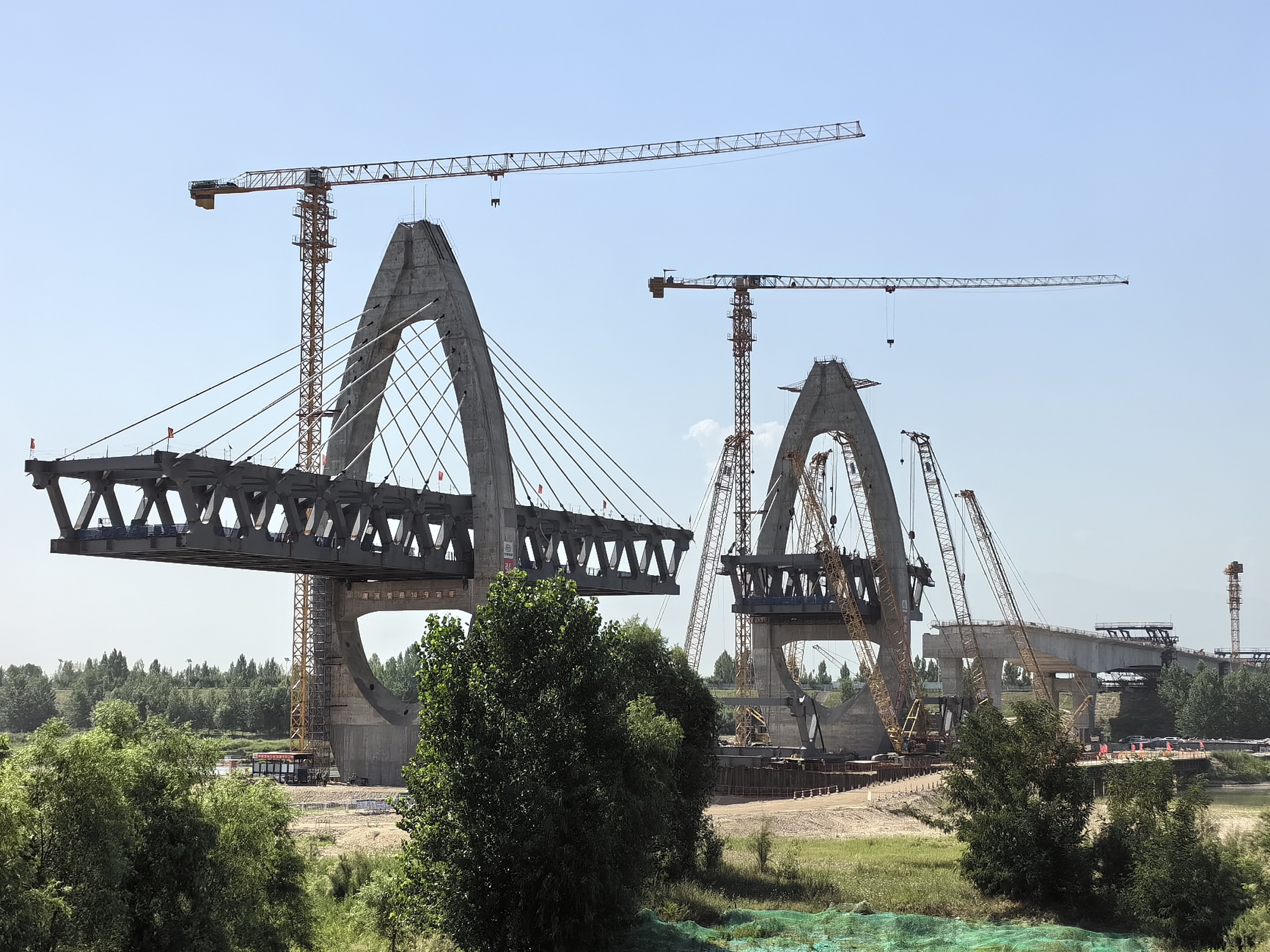 在半干的渭河河道上,几座水滴形的索塔一字排开,塔间吊起一截截镂空的桥体,正急切地向彼此延伸……6月25日,记者跟随“高质量发展调研行”陕西主题采访活动来到引汉济渭输配水工程施工现场,举目望去,施工中的渭河管桥已初现轮廓,在大桥落成后,来自黄池沟配水枢纽的水流会通过这里,流向渭河北岸的咸阳、武功、兴平、西咸新区等5个新城,实现长江与黄河的“握手”。