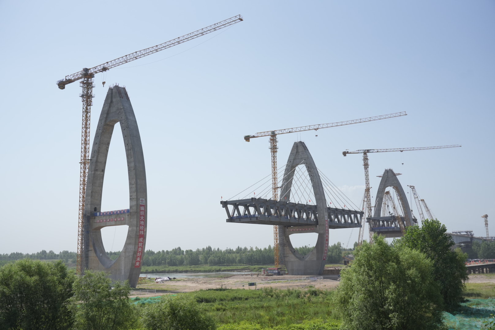 渭河管桥,横跨渭河两岸。在引汉济渭二期工程北干线渭河管桥施工现场,记者看到,4座水滴形的索塔高高耸立,两侧引桥已挺起骨架,施工人员正在开展钢桁梁安装作业。